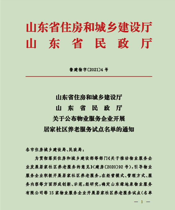 2021年9月6日,山東省住房和城鄉建設廳、山東省民政廳聯合公布了關于物業服務企業開展居家社區養老服務試點名單,我公司在首批試點名單之列。 ......