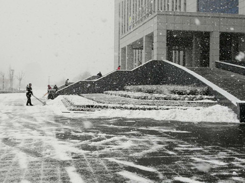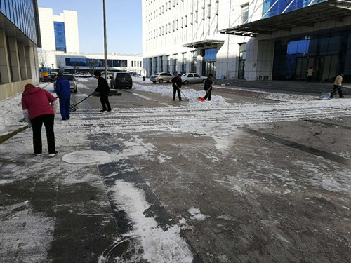 降雪持續(xù)一上午,項目人員不懼嚴寒反復清掃園區(qū)主干道、辦公樓臺階。對積雪較厚、壓實路段做撒鹽融雪處理,在鐵锨、除雪車“咣咣嚓嚓”中,積雪被鏟除干凈,道路逐漸恢復原貌,全力保障車輛和人員安全出行。
